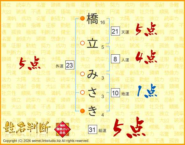 橋立みさきさんの総運は31画の5点!