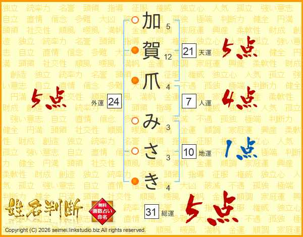 加(5画)賀(12画)爪(4画) み(3画)さ(3画)き(4画)
