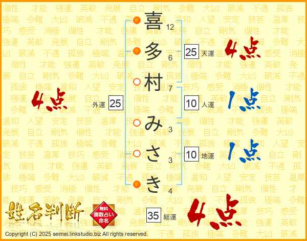喜(12画)多(6画)村(7画) み(3画)さ(3画)き(4画)