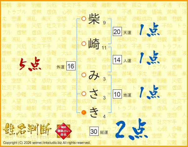 柴(9画)崎(11画) み(3画)さ(3画)き(4画)