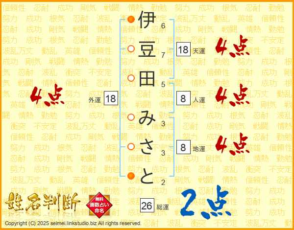伊豆田みさとさんの総運は26画の2点!