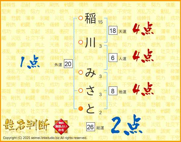 稲川みさとさんの総運は26画の2点!