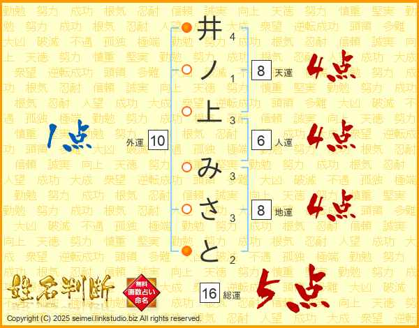 生活面を象徴する運勢です。外部から受ける影響力を表し、結婚運、家庭運や職場、環境への順応性を表します。総運から人運を引いた画数。姓や名が1文字の場合を除く。