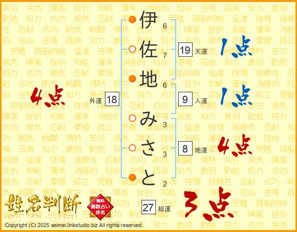 伊(6画)佐(7画)地(6画) み(3画)さ(3画)と(2画)
