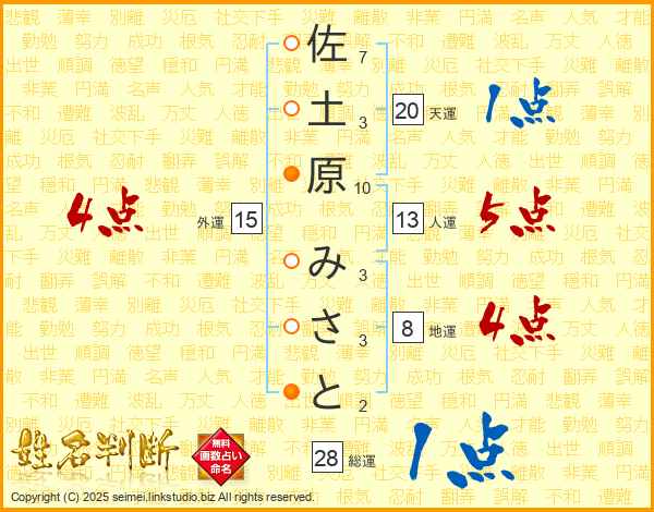 生活面を象徴する運勢です。外部から受ける影響力を表し、結婚運、家庭運や職場、環境への順応性を表します。総運から人運を引いた画数。姓や名が1文字の場合を除く。