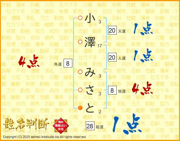 小(3画)澤(17画) み(3画)さ(3画)と(2画)