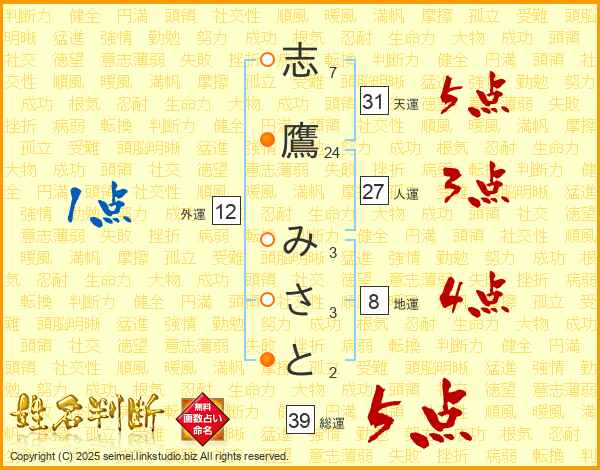 志(7画)鷹(24画) み(3画)さ(3画)と(2画)