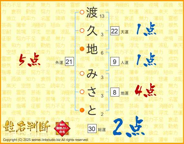 生活面を象徴する運勢です。外部から受ける影響力を表し、結婚運、家庭運や職場、環境への順応性を表します。総運から人運を引いた画数。姓や名が1文字の場合を除く。