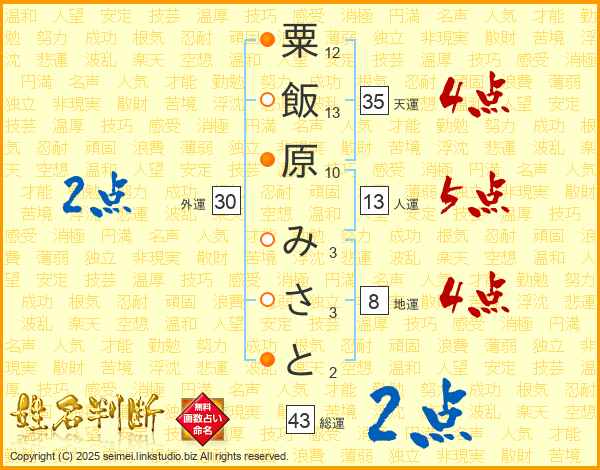 粟(12画)飯(13画)原(10画) み(3画)さ(3画)と(2画)