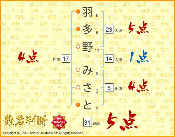生活面を象徴する運勢です。外部から受ける影響力を表し、結婚運、家庭運や職場、環境への順応性を表します。総運から人運を引いた画数。姓や名が1文字の場合を除く。