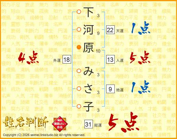 下(3画)河(9画)原(10画) み(3画)さ(3画)子(3画)