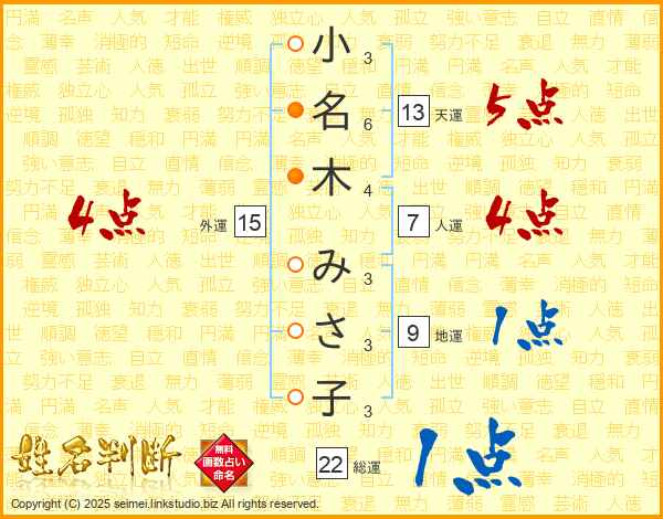 小(3画)名(6画)木(4画) み(3画)さ(3画)子(3画)