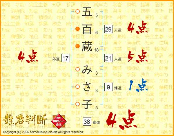 五百蔵みさ子さんの総運は38画の4点!
