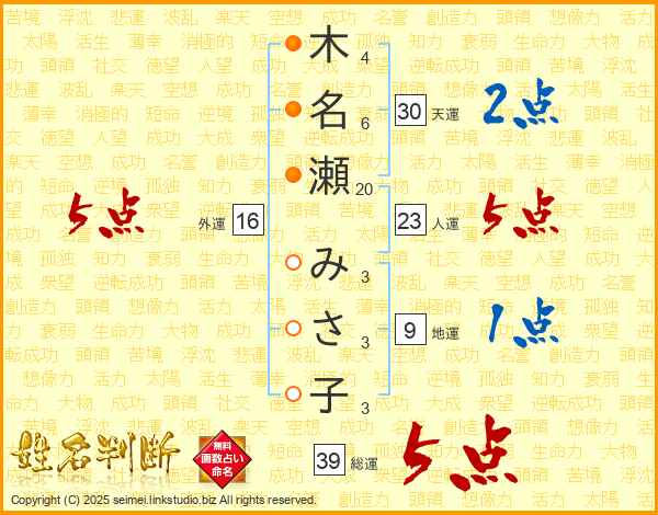 木(4画)名(6画)瀬(20画) み(3画)さ(3画)子(3画)