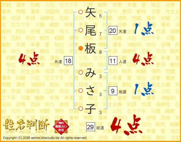 矢(5画)尾(7画)板(8画) み(3画)さ(3画)子(3画)