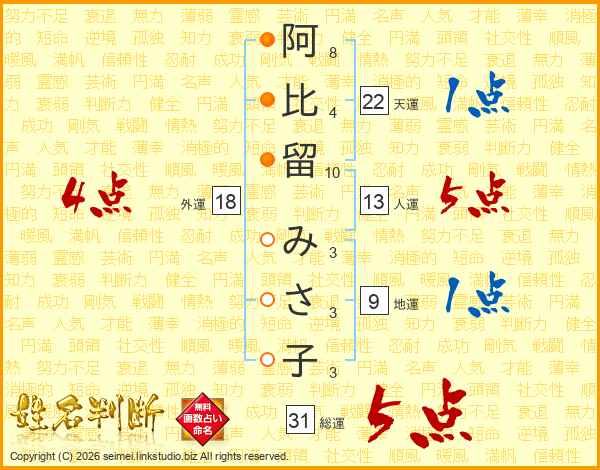 阿比留みさ子さんの総運は31画の5点!