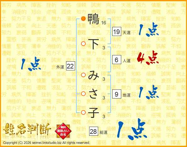 鴨(16画)下(3画) み(3画)さ(3画)子(3画)