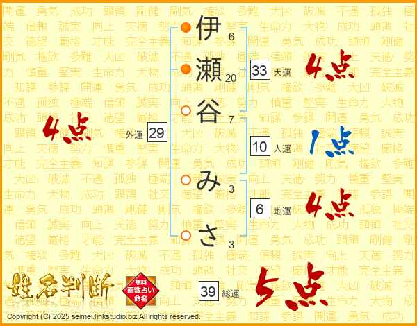 伊(6画)瀬(20画)谷(7画) み(3画)さ(3画)