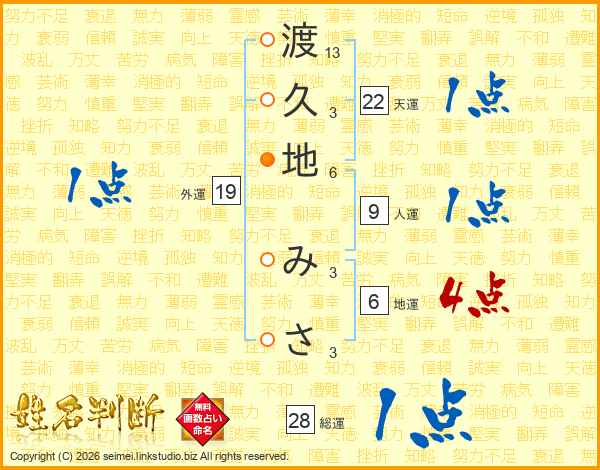 生活面を象徴する運勢です。外部から受ける影響力を表し、結婚運、家庭運や職場、環境への順応性を表します。総運から人運を引いた画数。姓や名が1文字の場合を除く。