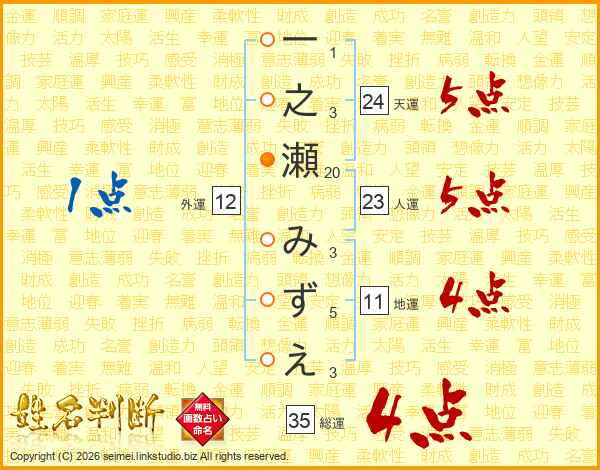 一(1画)之(3画)瀬(20画) み(3画)ず(5画)え(3画)