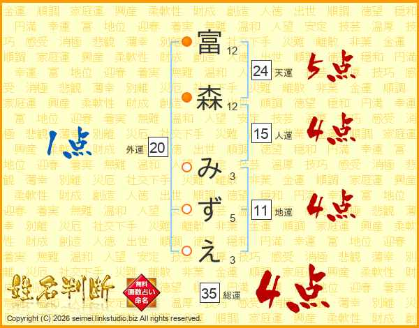富(12画)森(12画) み(3画)ず(5画)え(3画)