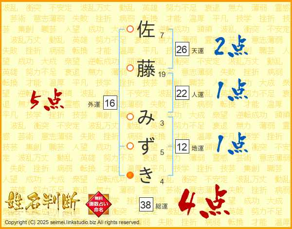 佐(7画)藤(19画) み(3画)ず(5画)き(4画)
