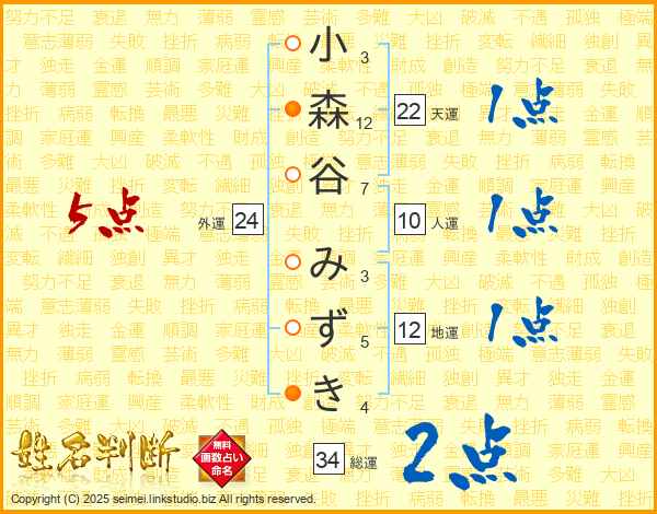 小(3画)森(12画)谷(7画) み(3画)ず(5画)き(4画)