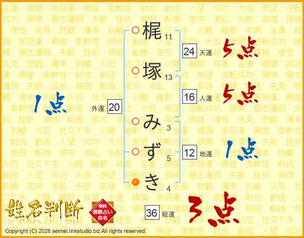 梶(11画)塚(13画) み(3画)ず(5画)き(4画)