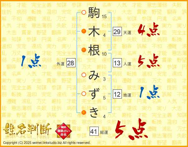 駒(15画)木(4画)根(10画) み(3画)ず(5画)き(4画)