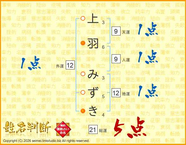 上(3画)羽(6画) み(3画)ず(5画)き(4画)