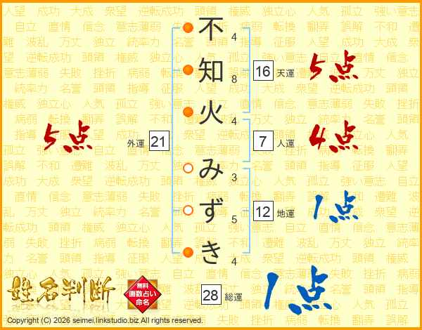 不(4画)知(8画)火(4画) み(3画)ず(5画)き(4画)