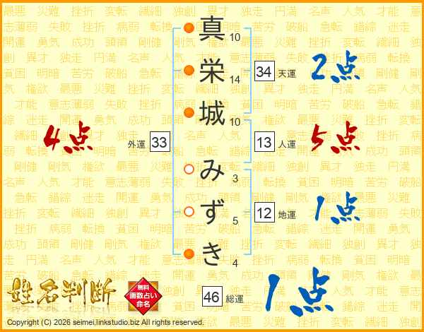 真(10画)栄(14画)城(10画) み(3画)ず(5画)き(4画)