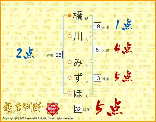 橋(16画)川(3画) み(3画)ず(5画)ほ(5画)