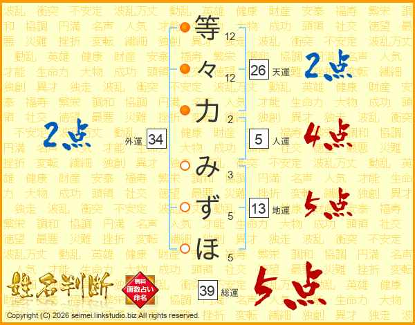 生活面を象徴する運勢です。外部から受ける影響力を表し、結婚運、家庭運や職場、環境への順応性を表します。総運から人運を引いた画数。姓や名が1文字の場合を除く。