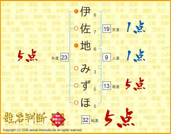 伊(6画)佐(7画)地(6画) み(3画)ず(5画)ほ(5画)