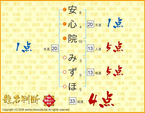 安(6画)心(4画)院(10画) み(3画)ず(5画)ほ(5画)