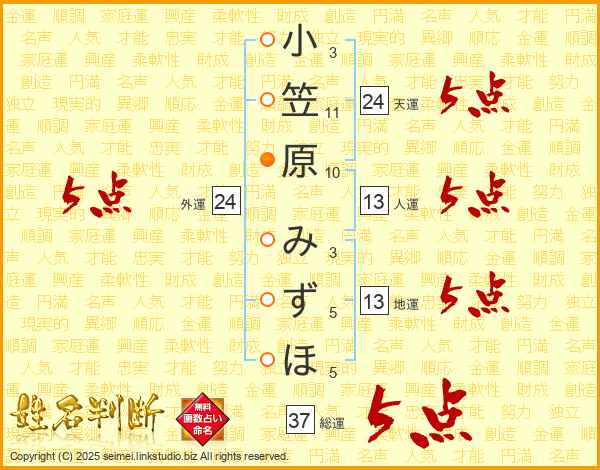 小(3画)笠(11画)原(10画) み(3画)ず(5画)ほ(5画)