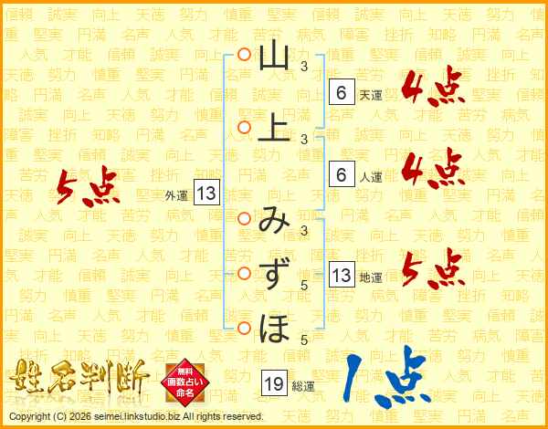 山(3画)上(3画) み(3画)ず(5画)ほ(5画)