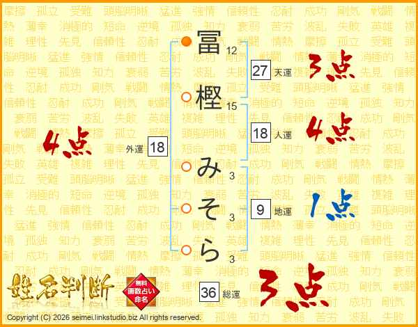 冨(12画)樫(15画) み(3画)そ(3画)ら(3画)