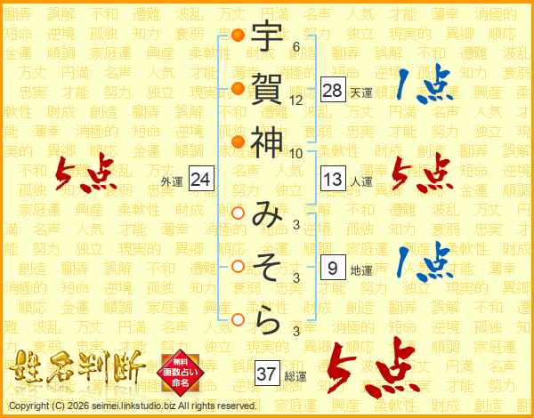 宇賀神みそらさんの総運は37画の5点!