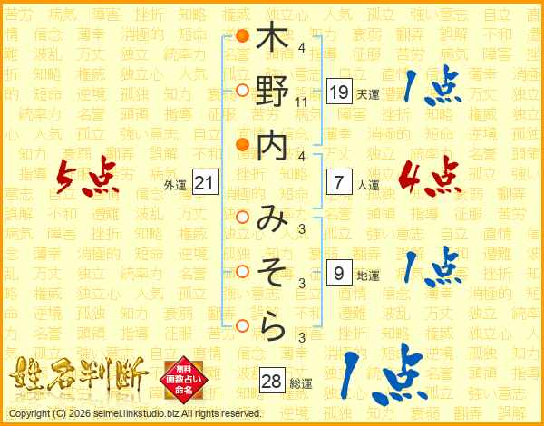生活面を象徴する運勢です。外部から受ける影響力を表し、結婚運、家庭運や職場、環境への順応性を表します。総運から人運を引いた画数。姓や名が1文字の場合を除く。
