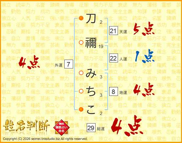 刀禰みちこさんの総運は29画の4点!