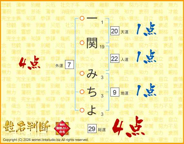生活面を象徴する運勢です。外部から受ける影響力を表し、結婚運、家庭運や職場、環境への順応性を表します。総運から人運を引いた画数。姓や名が1文字の場合を除く。