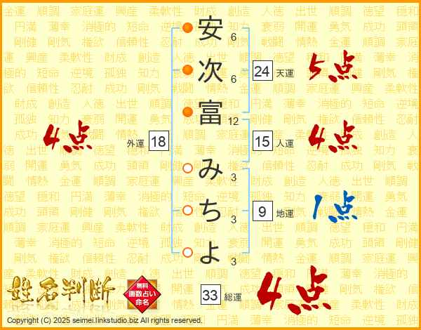 安(6画)次(6画)富(12画) み(3画)ち(3画)よ(3画)