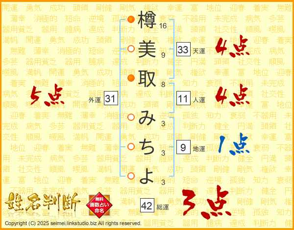 生活面を象徴する運勢です。外部から受ける影響力を表し、結婚運、家庭運や職場、環境への順応性を表します。総運から人運を引いた画数。姓や名が1文字の場合を除く。