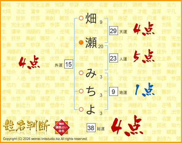 畑瀬みちよさんの総運は38画の4点!