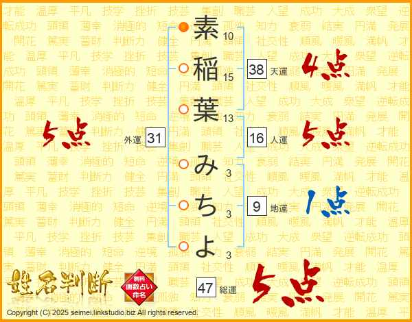 素(10画)稲(15画)葉(13画) み(3画)ち(3画)よ(3画)