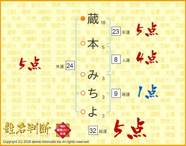 蔵本みちよさんの総運は32画の5点!