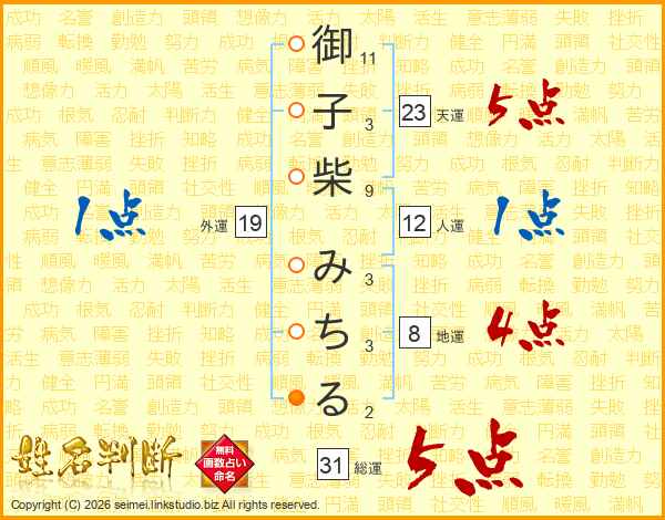 御(11画)子(3画)柴(9画) み(3画)ち(3画)る(2画)