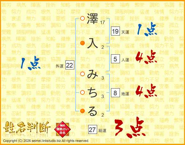 澤(17画)入(2画) み(3画)ち(3画)る(2画)